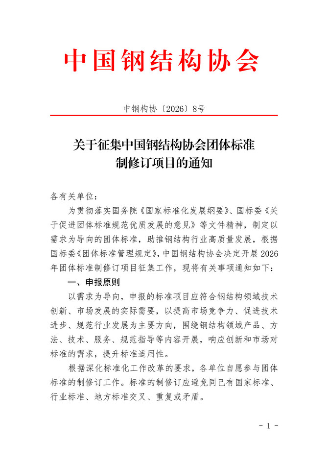 關(guān)于征集中國鋼結(jié)構(gòu)協(xié)會團體標準制修訂項目的通知